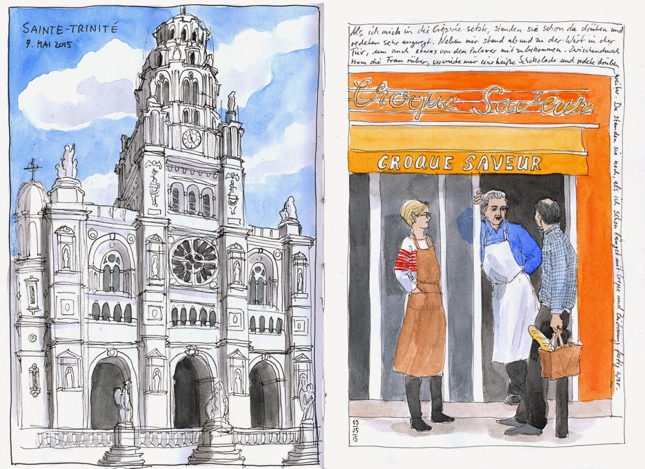 Noch zwei Zeichnungen vom Montmartre. Bei dieser hier habe ich aus Zeitgründen die Farbe erst zuhause und mithilfe eines Fotos zugefügt. Darunter die Zeichnung, die vor Ort entstanden ist (dasselbe bei der Fontaine unten). Also Vorsicht: nur die Strichzeichnung ist echtes "Urban Sketching"!